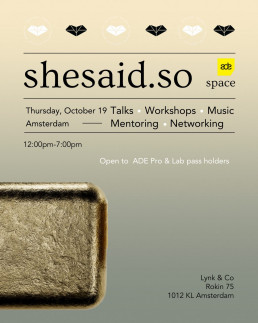 On Friday afternoon, the team behind the shesaid.so Amsterdam chapter is hosting a mixer that marks the relaunch of the local community. Free to attend with RSVP from 3-5pm at the Fuga offices in the heart of Amsterdam. shesaid.so’s activities at ADE conclude on Saturday, October 21st with a full day of music and experiences at Cosmopolitan’s Clubhouse that is free to attend with RSVP.
